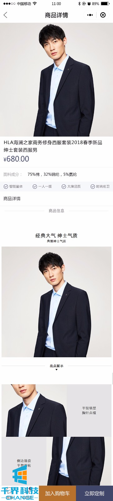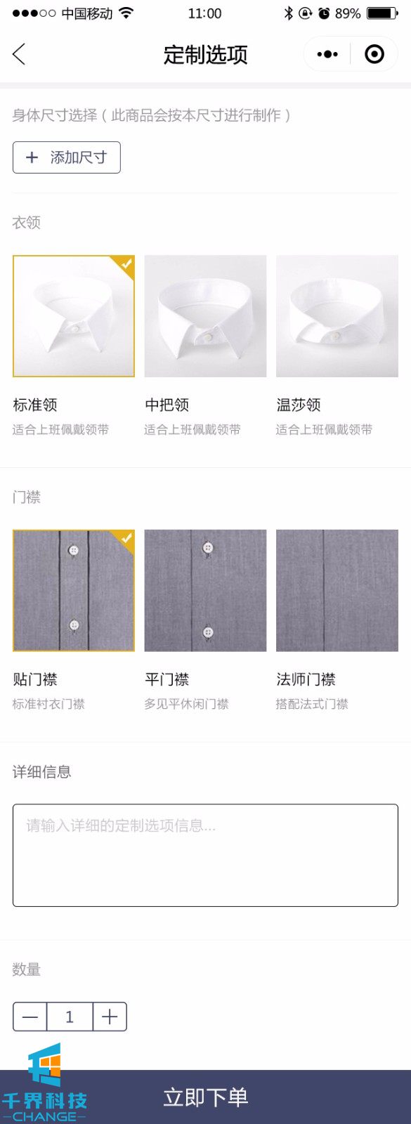 該項目是服裝定制小程序,包含在線(xiàn)下單、定制選項、尺寸上傳、訂單等