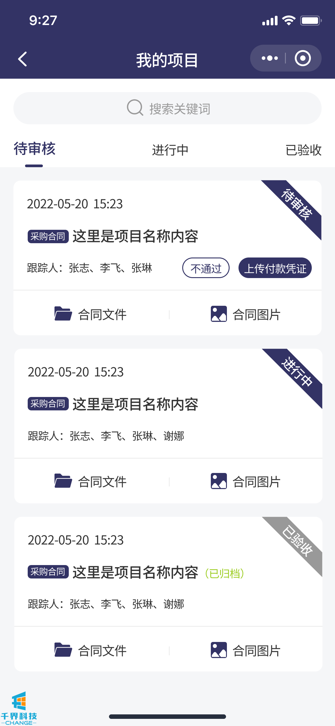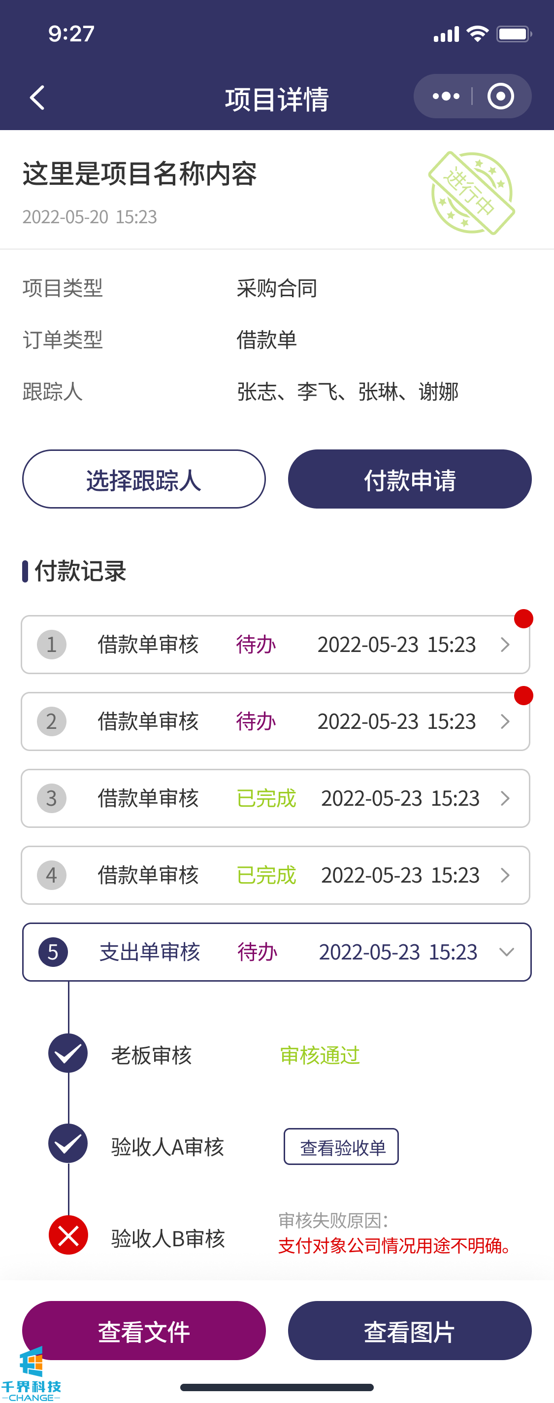 該項目是一個(gè)解決企業(yè)內部付款審批流程的線(xiàn)上程序。包含了負責人,法務(wù),領(lǐng)導,驗收人員,財務(wù),出納。根據設定的流程依次審批??梢詫?shí)現多合同,多次付款審批,每次付款記錄多角色審核明細等